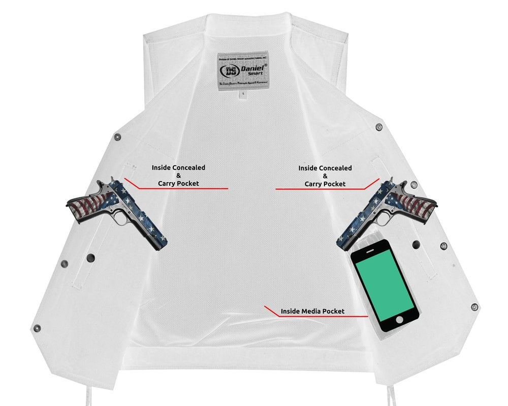 2 Front pockets & 2 inside Smart Access Pockets made of special heavy duty textile with built-in holsters and snap closure.