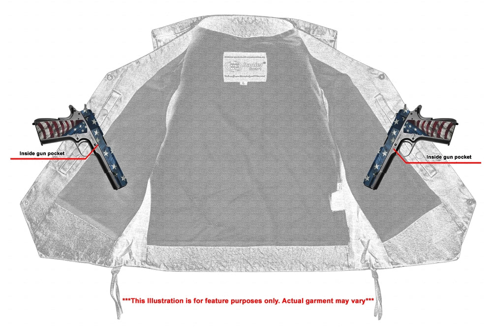 2 inside Smart Access Pockets made of special heavy-duty textile with built-in holsters and snap closure.