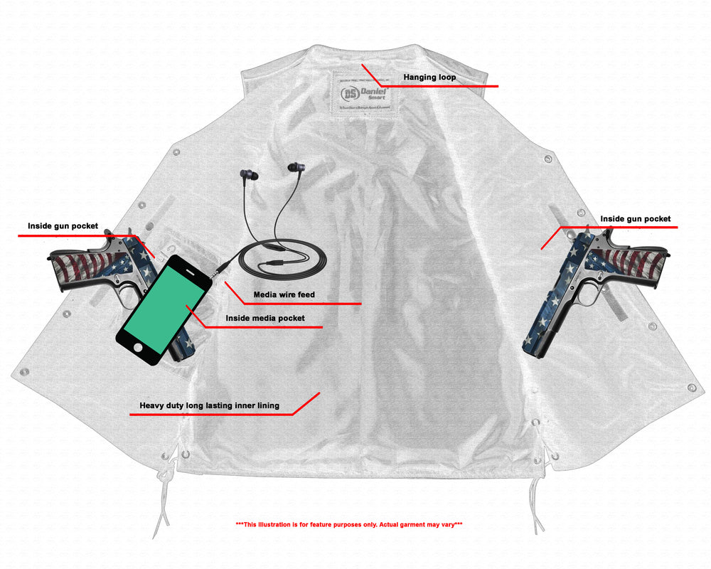 2 inside Smart Access Pockets made of special heavy-duty textile with built-in holsters and snap closure.