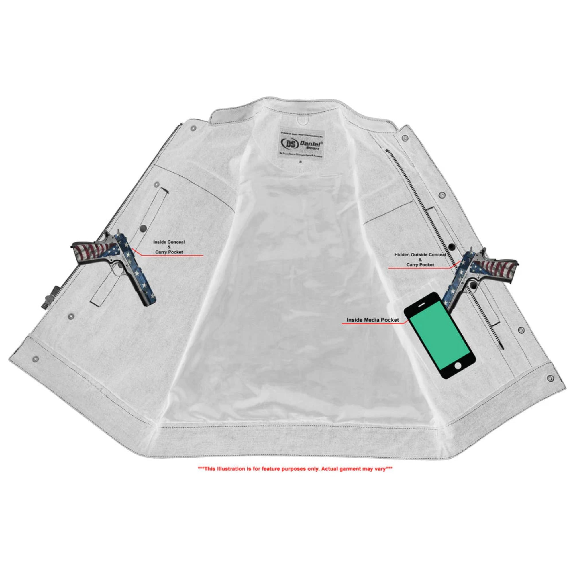 Finding the right vest can keep you comfortable on the road, protect you from the wind and sun and help you carry your Safety Tools wherever you go. Our concealed carry vests have reinforced shoulders for better concealment. This men’s Smart Access Pockets motorcycle vest with side zippers is adjustable, with a customizable single-panel back.