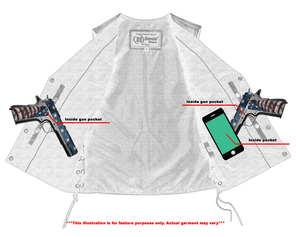 2 inside Smart Access Pockets made of special heavy-duty textile with built-in holsters and snap closure.
