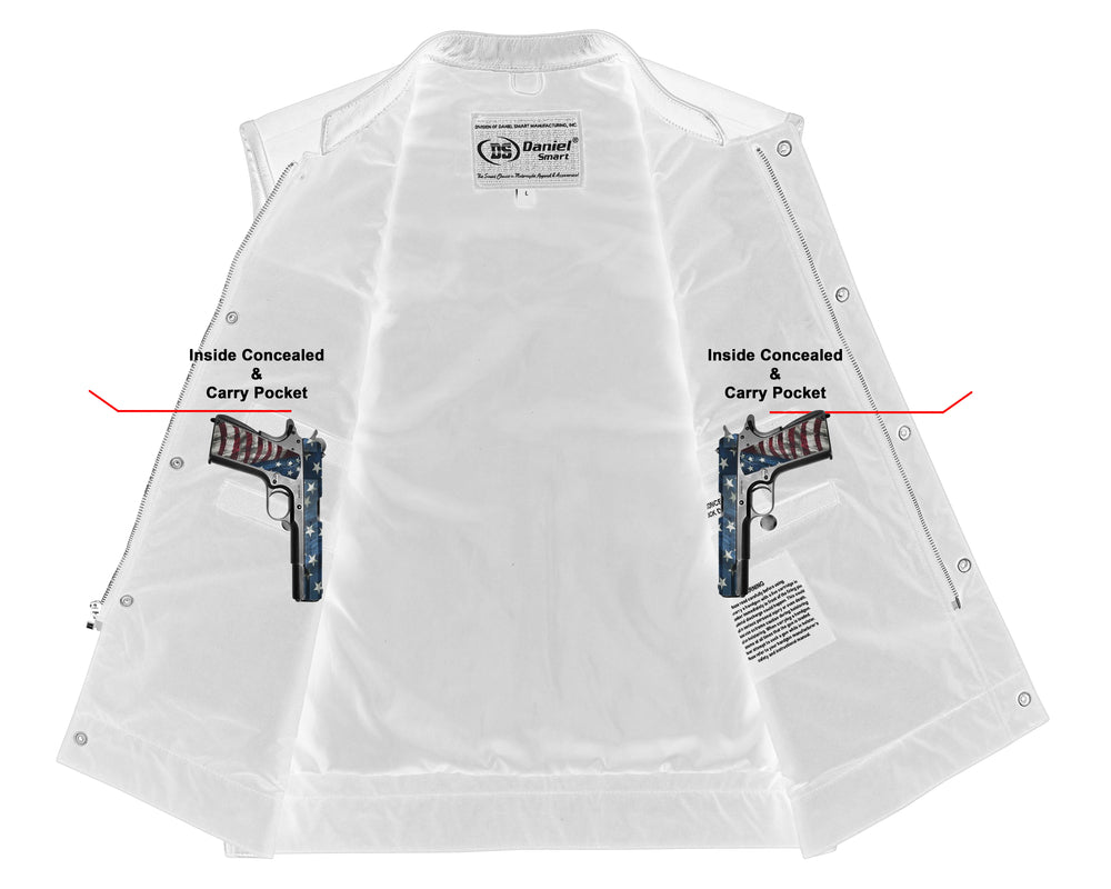 2 inside Smart Access Pockets made of special heavy duty textile with built-in holsters and snap closure.