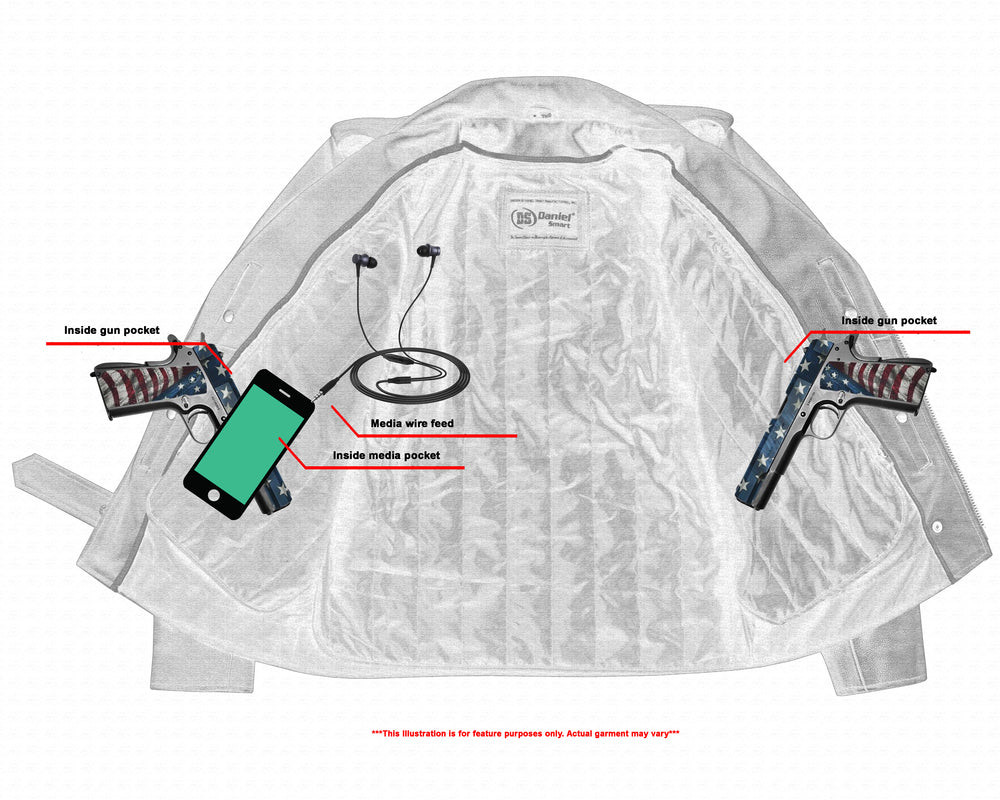 2 inside Smart Access Pockets made of special heavy-duty textile with built-in holsters and snap closure.