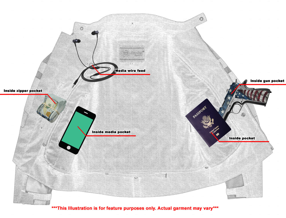 1 inside left-hand side Smart Access Pockets made of special heavy-duty textile with built-in holsters and snap closure.