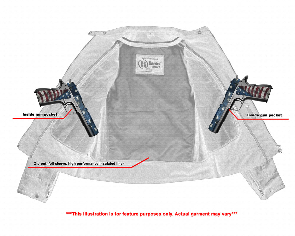 2 inside Smart Access Pockets made of special heavy-duty textile with built-in holsters and snap closure.