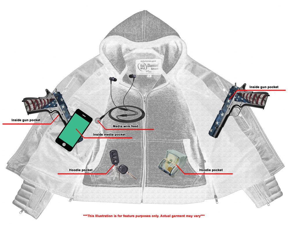 2 inside Smart Access Pockets made of special heavy duty textile with built-in holsters and snap closure.