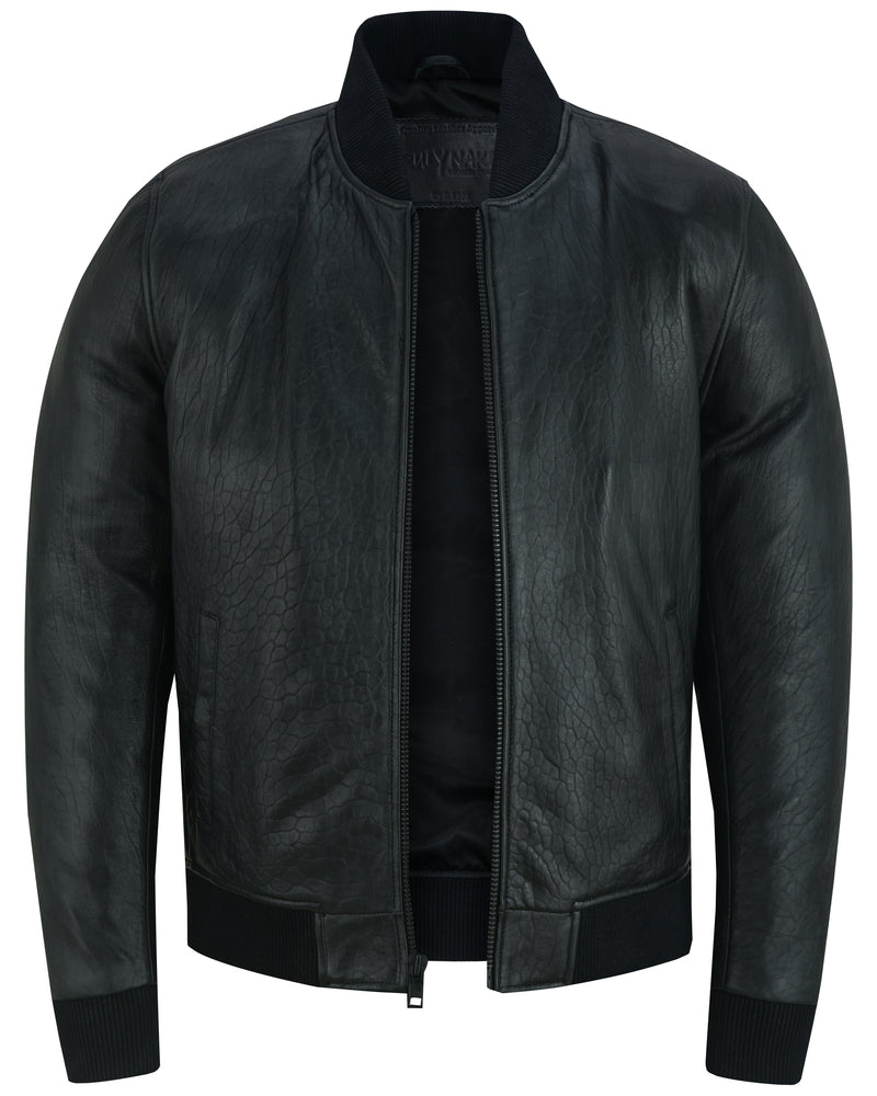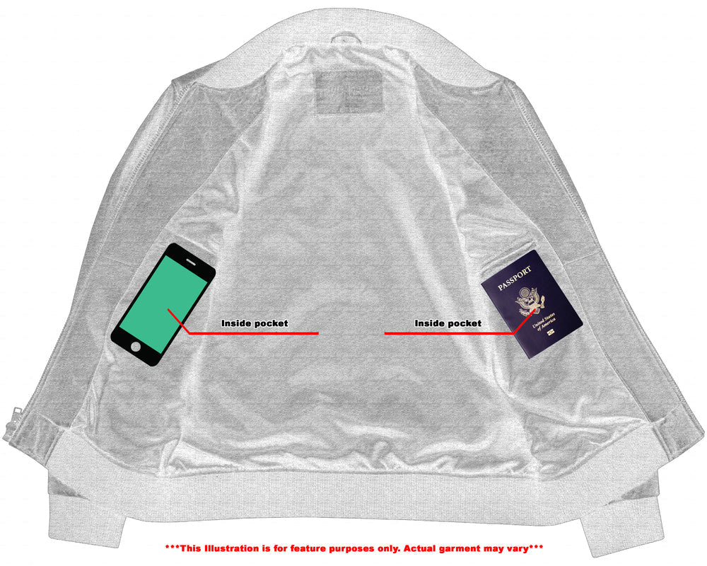 Traditional bomber jacket with center zipper.